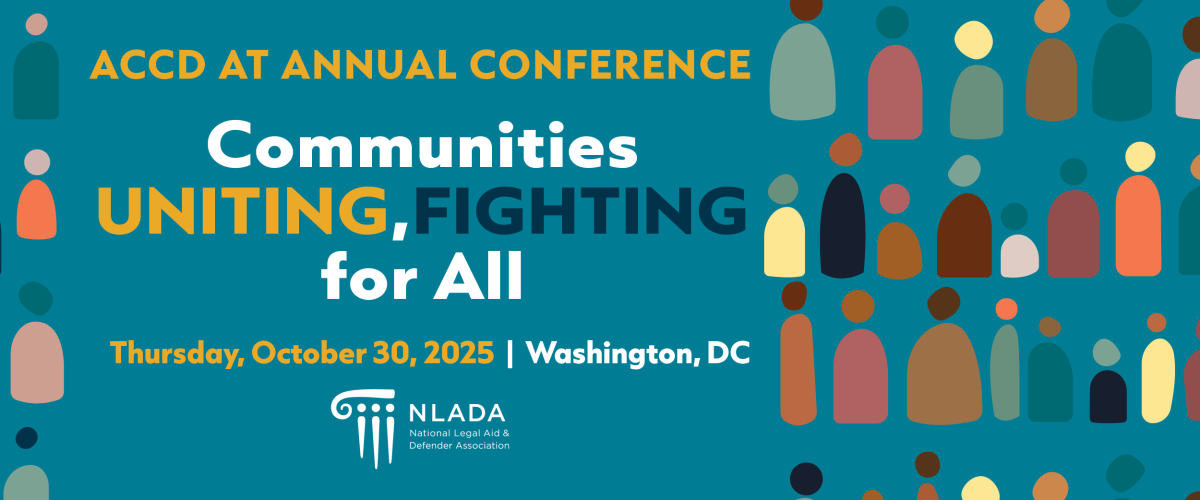 The American Council of Chief Defenders (ACCD) is a national community of public defense leaders dedicated to securing a fair justice system and ensuring high quality legal representation for people facing loss of life, freedom, or family. A practice section of NLADA, ACCD draws from NLADA’s network of defenders to bring together chief and deputy chiefs of diverse indigent defense programs, including public defender offices, assigned counsel systems, and contract systems. ACCD members collaborate through a listserv and annual conferences.