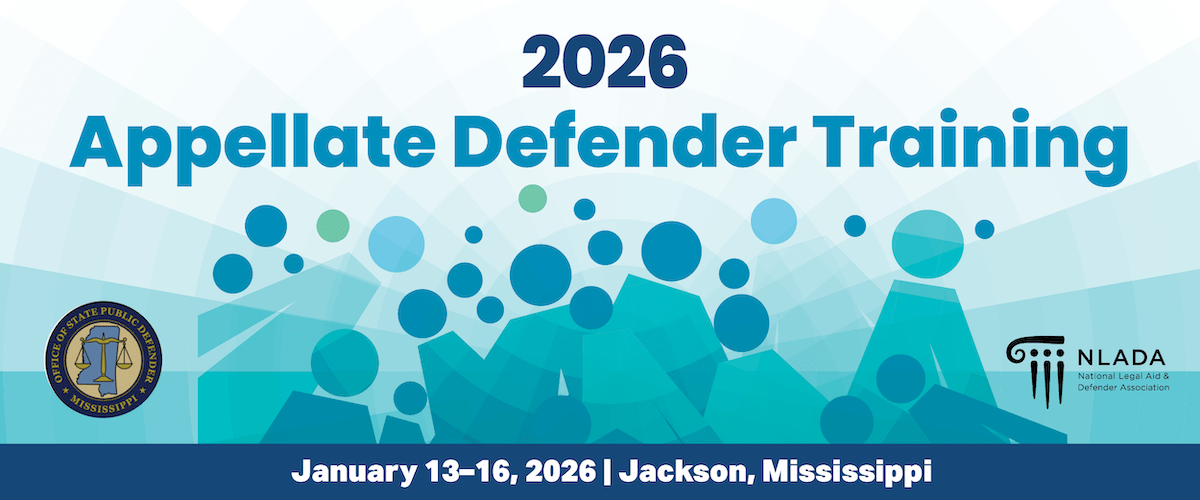 NLADA and the Mississippi Office of State Public Defender bring you the 2026 Appellate Defender Training in Jackson, MS. This renowned bring-your-own-case program will offer a mixture of plenary sessions and small group workshops to help attorneys develop their appellate skills.