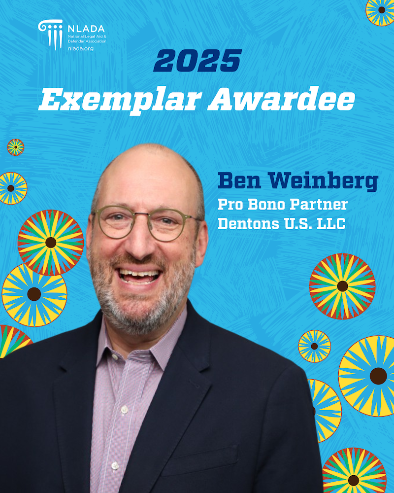 NLADA is pleased to announce that Ben Weinberg, the Pro Bono Partner at Dentons, will be honored with the 2025 NLADA Exemplar Award for his extraordinary leadership and efforts in managing the substantial pro bono programs at Dentons and working as an advocate for pro bono work at firms across the country are a shining example of championing the rights of the less fortunate. For more information click HERE.