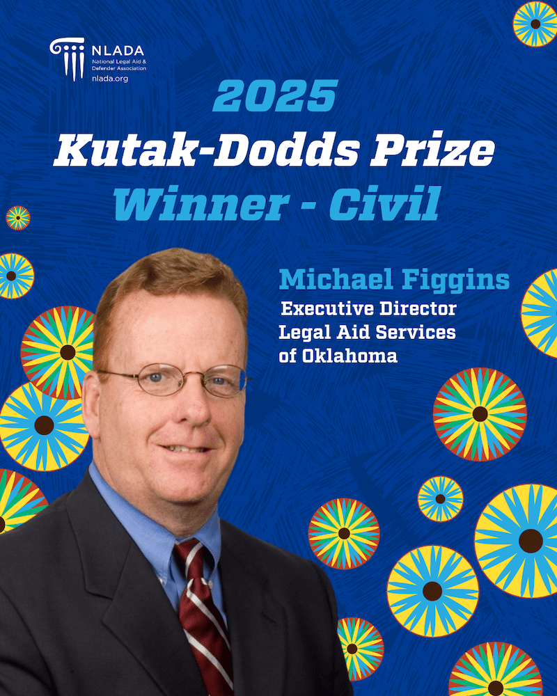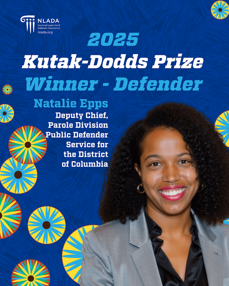 The 2025 Kutak-Dodds Prize winners are Natalie Epps, Deputy Chief, Parole Division at Public Defender Service for the District of Columbia (Defender) and Michael Figgins, Executive Director of Legal Aid Services of Oklahoma (Civil). To learn more click here.