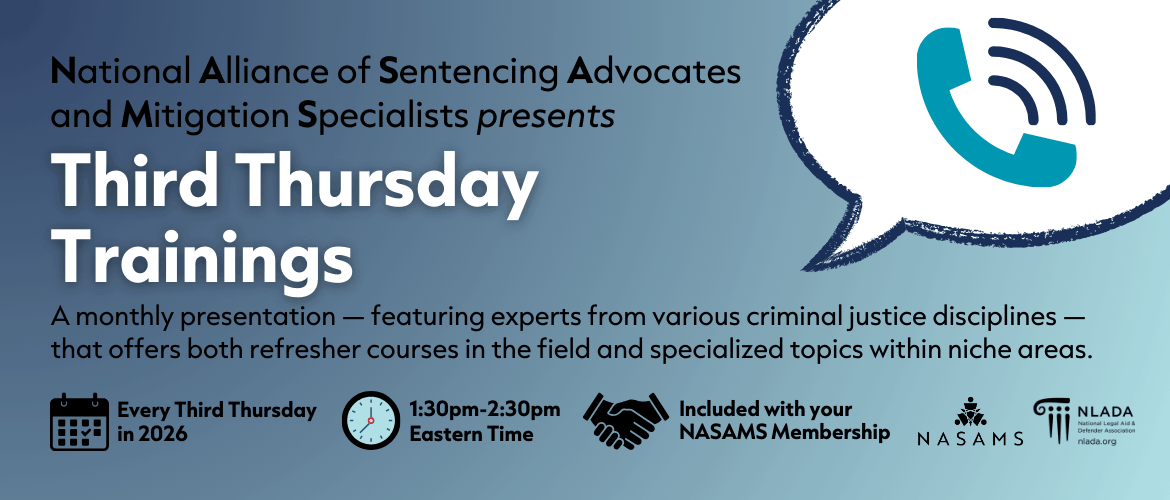 NASAMS Third Thursday Trainings are monthly presentations where we feature experts in various criminal justice disciplines. These presentations will be both refresher courses in the field and specialized topics within niche areas. Each presenter is offering a fresh perspective that stems from their years of experience. All NLADA members are welcome. If there is a certain topic of interest that you'd like to see covered in the future, please let us know by email: [email protected].
