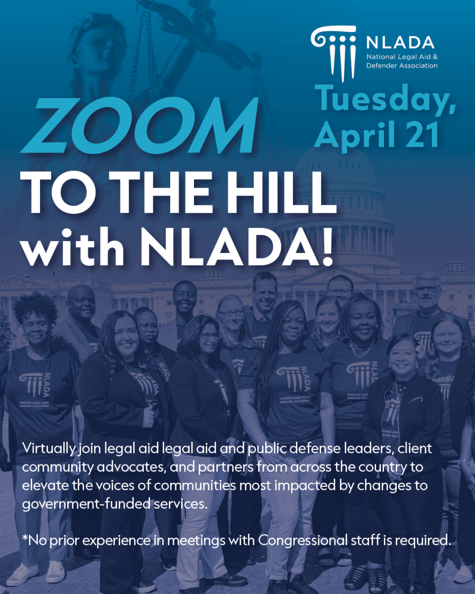 NLADA’s Virtual Hill Day brings together legal aid and public defense leaders, client community advocates, and partners from across the country to elevate the voices of communities most impacted by changes to government-funded services. Participants will engage directly with policymakers to:
